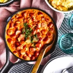 - Once everything thickened, add in the cream and let everything simmer until nice and thick. Garnish with parsley and chives and serve with sweet pickles and mashed potatoes.